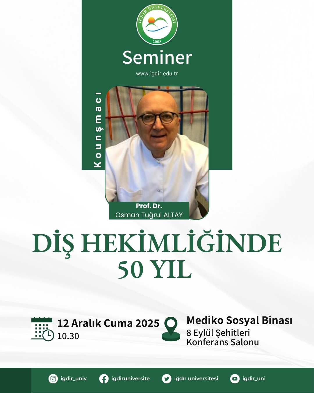 Iğdır Üniversitesi tarafından düzenlenen “Diş Hekimliğinde 50 Yıl” başlıklı seminerde, alanında uzman Prof. Dr. Osman Tuğrul ALTAY tecrübelerini paylaşacaktır. Diş hekimliğinde yarım asırlık birikimi ve mesleki yolculuğunu aktardığı bu özel seminere tüm akademik personel, öğrenciler ve ilgililer davetlidir.