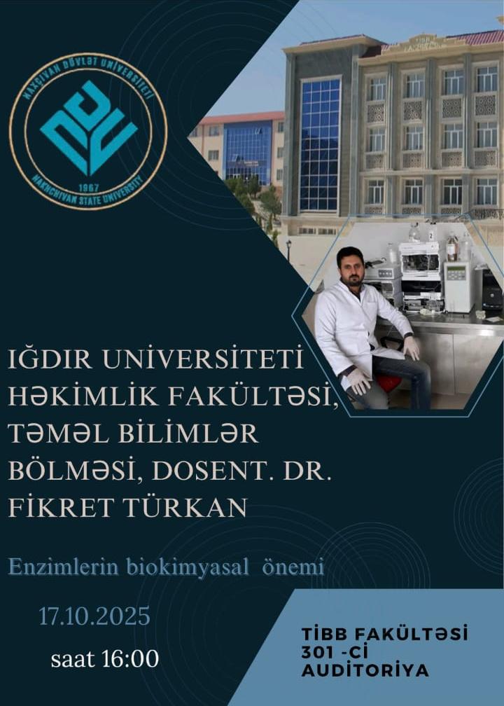 Iğdır Üniversitesi Diş Hekimliği Fakültesi öğretim üyesi Doç. Dr. Fikret Türkan, 17 Ekim Cuma günü Nahçıvan Devlet Üniversitesi Tıp Fakültesi öğrenci ve akademisyenlerine yönelik olarak “Enzimler ve Biyokimyasal Önemi” konulu bir webinar gerçekleştirdi.